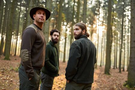 Group of foresters or foresters in the woods in autumn on a patrol