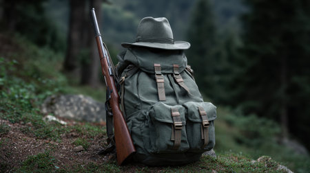 A picturesque scene featuring a rustic backpack beside a hunting hat and rifle, set against a serene forest backdrop, epitomizing outdoor adventure.