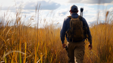 A hunter walks through golden grasslands at sunset, preparing for a peaceful evening in nature, carrying equipment and a sense of adventure