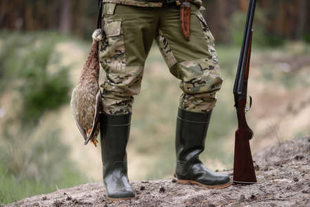 Bird Hunter Legs in Rubber Boots Summer Forest.