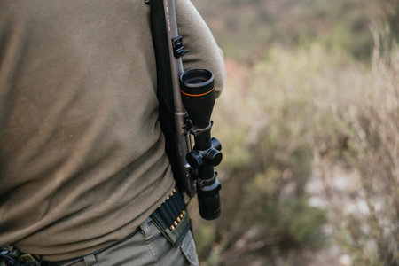 Hunter with hunting gun and hunting form to hunt. Shooter sighting in the target. The man is on the hunt