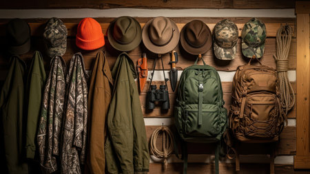 Realistic hunting setup with gear, wildlife, and outdoor elements on a rugged wooden backdrop. A.I.