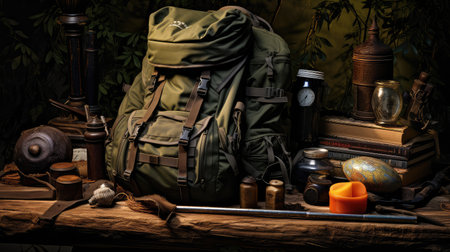 Hunter backpack top view, tools, weapons, equipment, wooden table, tough design. Art reflects military gear vibe.