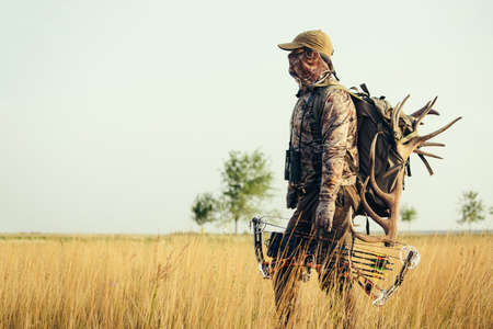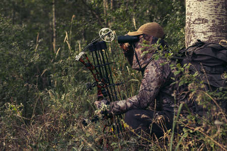 Close up shot of a hunter dressed in camouflage clothing holding a modern bow.
