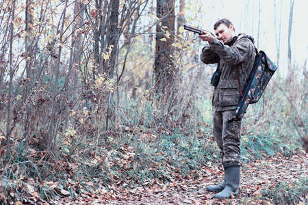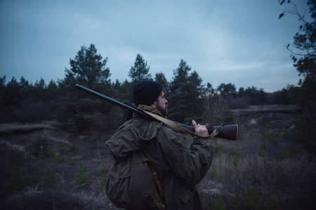 Autumn hunting season. Hunter with shotgun gun on hunt. Autunm hunting. Poacher with Rifle Spotting Some Deers. Close up Portrait of hamdsome Hunter.
