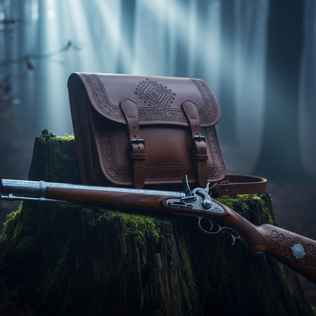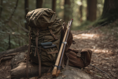 A picturesque scene featuring a rustic backpack beside a hunting hat and rifle, set against a serene forest backdrop, epitomizing outdoor adventure.