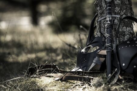 Accessories of a knight isolated on the sand during the day. Conceptual image. Sand is spreading.