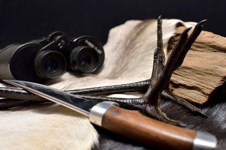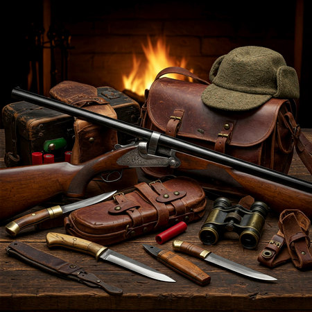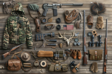 Realistic hunting setup with gear, wildlife, and outdoor elements on a rugged wooden backdrop. A.I.