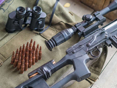 Sniper rifle, binoculars and ammunition on the wooden floor.