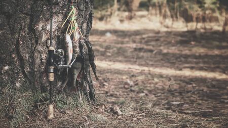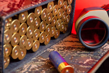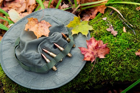 Hunting rifle and cartridges in the autumn forest close-up. The hunting period, the fall season is open, the search for prey