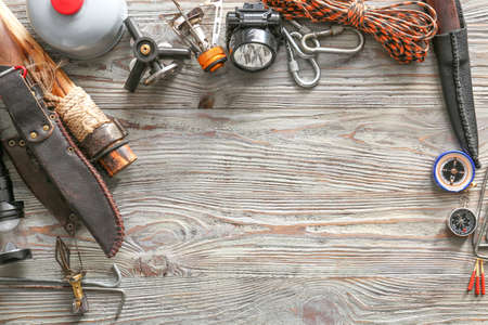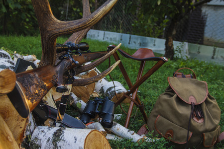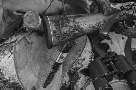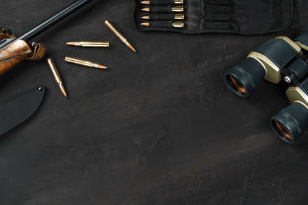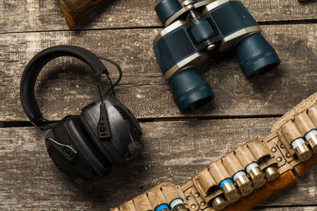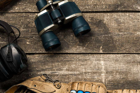 Hunting equipment on old wooden background including rifle, knife, binoculars and cartridges