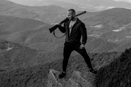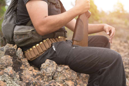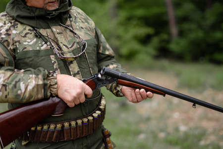 The man is on the hunt, sport. Hunter man, closeup. Hunting period. Male with a gun, rifle. Man is charging a hunting rifle