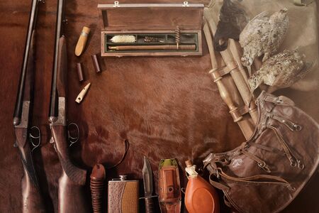 Hunting concept with woodcock, shotgun, knife and ammunition for hunting arranged on brown background. Wildfowl hunting.