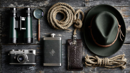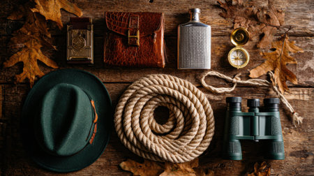 A collection of vintage outdoor adventure items including a hat, rope, binoculars, compass, and flask, laid out on a weathered wooden background with fallen autumn leaves.