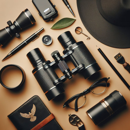 A collection of vintage exploration items including a map, magnifying glass, compass, binoculars, camera, and leather pouch.