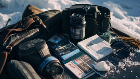 hiking backpack with trekking poles and walking stick ready for hiking adventure, created with generative ai