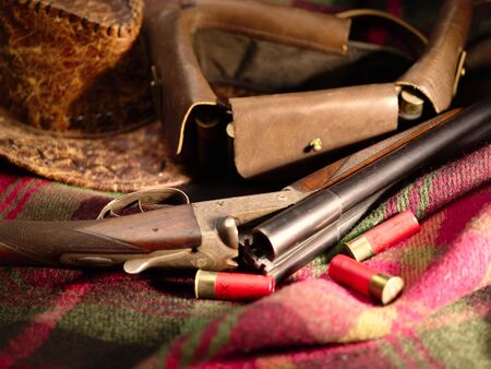 Hunter equips the retro double-barreled shotgun with cartridges, close up. Hunting season.