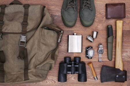 Hunter backpack top view, tools, weapons, equipment, wooden table, tough design. Art reflects military gear vibe.