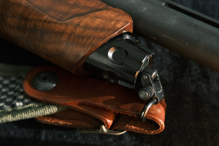 shell magazine into the barrel of a long shotgun on dark background with leather belt.