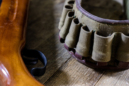Hunting rifle and ammunition lie on a wooden background. Copy space.