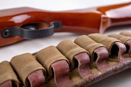 Old solid belt for cartridges for hunting weapons. Accessories for hunters useful for hunting in the woods. Light background.