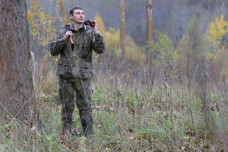 Autumn hunting season. Hunter with shotgun gun on hunt. Autunm hunting. Poacher with Rifle Spotting Some Deers. Close up Portrait of hamdsome Hunter.