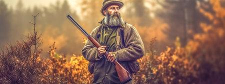 old hunter with a shotgun in the forest, banner made with Generative AI