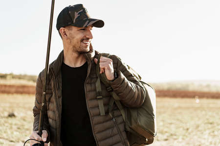 Portrait of hunting man holding his shotgun and smiling as he looks down