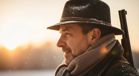 Man hunter in a hat with a shotgun on his shoulder in the winter forest during the golden hour. Hunting or outdoor recreation concept.