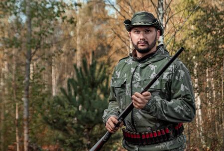 Hunter in the fall hunting season. Calibers of hunting rifles. Man holding shotgun. Hunting in spring forest.