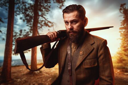 Portrait of a hunter with a gun in the forest. Hunting season.
