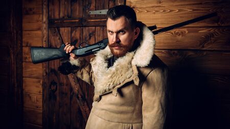 A portrait of a hunter man standing at the wooden house. Man, hunting, musket.