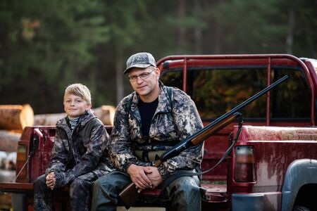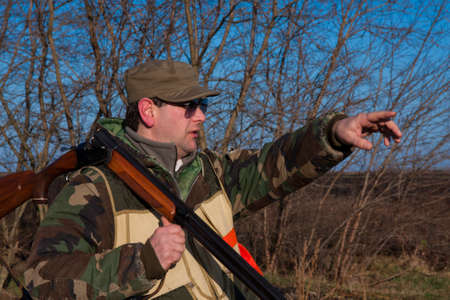 HunterS with shotgun gun on hunt. HunterS in camouflage clothes ready to hunt with hunting rifle.