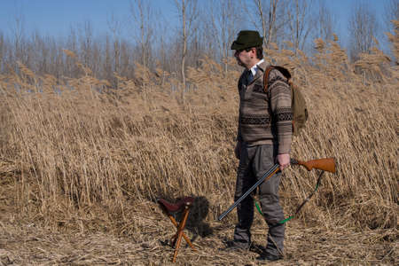 Young hunter hunt on ducks and wild animals in autumn, in nature. friendly Dog help him to hunt, sit together among grass, male with rifle shotgun, ready for hunting, in countryside