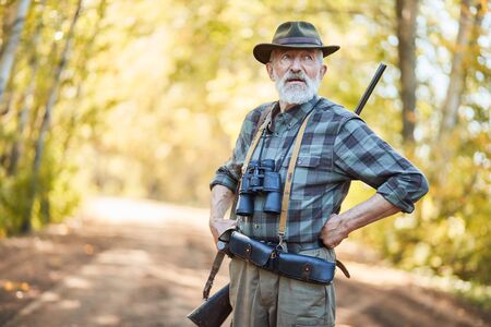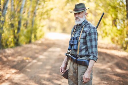 Older man stand looking for new trophy in forest, wearing hunting clothes. Shotgun on shoulder. Sunny autumn weather