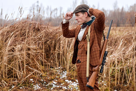 Hunter male adjust the hat, in suit. Hunter with hunting gun in nature, look at side. Hunting period, autumn season. Guy with rifle gun is getting ready for hunting on birds, wild animals