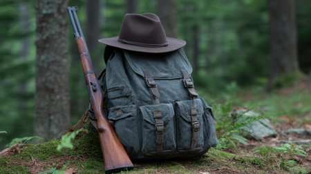 A picturesque scene featuring a rustic backpack beside a hunting hat and rifle, set against a serene forest backdrop, epitomizing outdoor adventure.