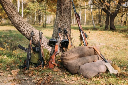 Soviet russian military ammunition - submachine gun of World War II on ground.