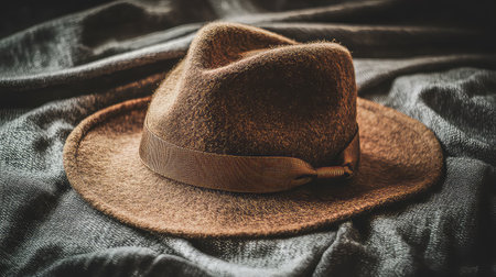A charming brown fedora hat placed elegantly on a dark textured fabric, showcasing the details and soft lighting, perfect for styling inspiration.