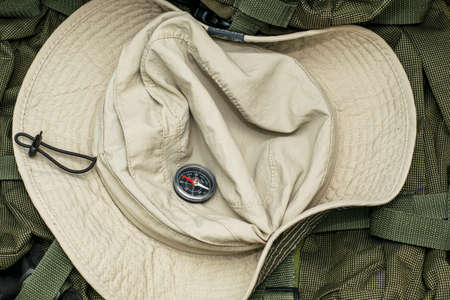 tourist hat and compass on the background of a backpack travel tourism concept. High quality photo