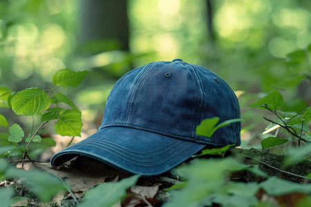 Blue denim baseball cap lies on the forest floor, surrounded by vibrant green leaves and dappled sunlight