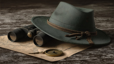 A still life composition featuring a vintage fedora hat, binoculars, and a compass resting on an aged map, evoking a sense of adventure and exploration.