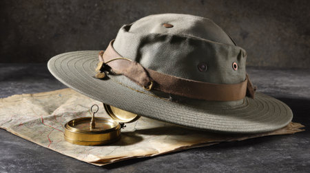 A close-up of a weathered safari hat resting on an antique map, with a brass compass nearby, evoking a sense of adventure and exploration.
