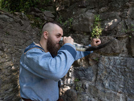 A Viking warrior drinks cider from a horn leaning against a stone wall, image of man in medieval clothes
