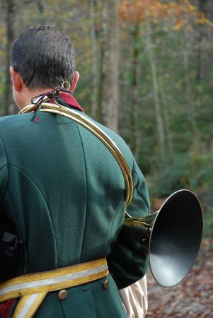 back of hunter in a traditional fox hunting with horn