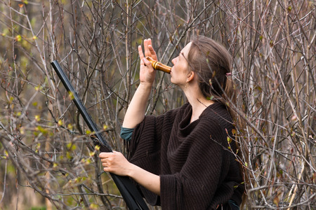 Woman hunter with wooden duck call in spring forest