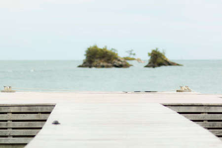 Seagull birds sit on a long stone pier at sea and blue sky. Pacific sea without waves