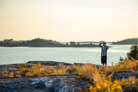 Hiker wearing a jacket and carrying a backpack walks along the beach and watches Lake Jatkonjarvi at sunset in Koli National Park, eastern Finland. Man aged 24 wearing sports clothes. Active lifestyle.