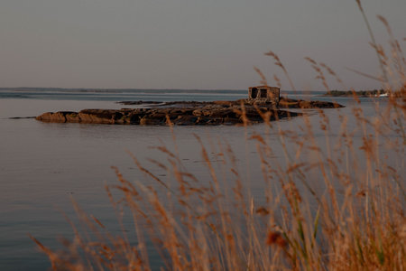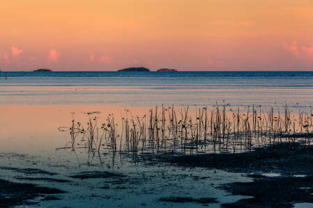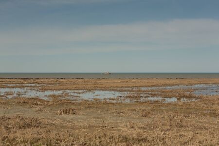 Deserted island in the sea with reeds and dry grass on the shore