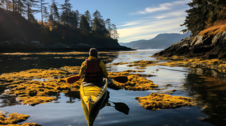 A man in a sea kayak paddling through clear, calm waters surrounded by a scenic coastal landscape with lush forests and distant mountains.